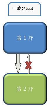 一般の「PPH」プログラムの申請要件によれば、下図に示すとおり、第1庁(出願人が最先に特許出願をした庁)で出された有利な審査結果は、第2庁(第1庁以外に特許出願をした庁)で参考にされるが、第2庁で先に審査結果が出された場合、第1庁はその審査結果を参考にすることができない。