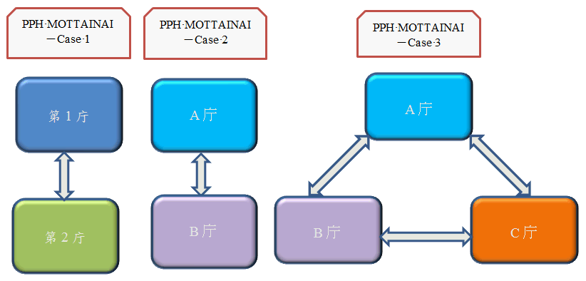 下図Case 1のとおり、「PPH MOTTAINAI」では、第1庁と第2庁との間で、先に出された有利な審査結果を相互に利用することができるようになったが、そればかりでなく、下図Case 2のように、A庁、B庁のいずれもが第1庁ではない場合も、双方が「PPH MOTTAINAI」を締結しており、A庁への出願とB庁への出願が同一の最先の優先日を主張していれば、一方の庁で先に出された有利な審査結果を、他方の庁で利用することができる。さらには、下図Case 3のように、A庁、B庁及びC庁との間で「PPH MOTTAINAI」が締結されており、かつ、それぞれの出願の最先の優先日が同一である場合にも、先に出された有利な審査結果を、他の二つの庁で利用することができる。