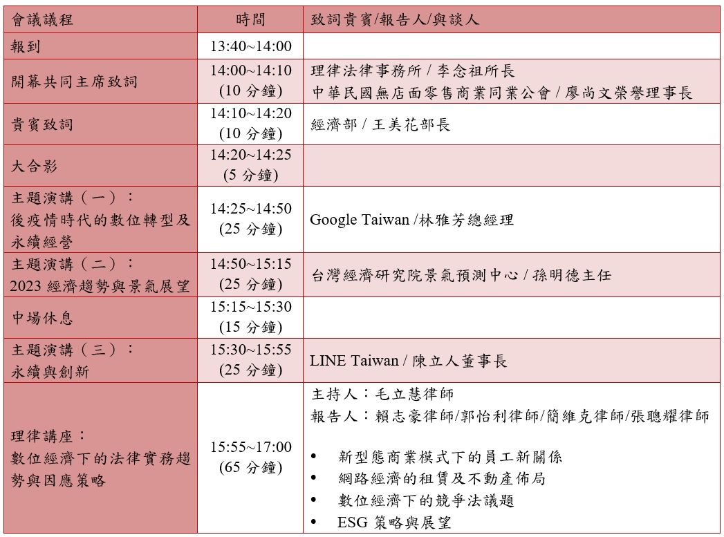 為協助企業及公會會員因應市場環境快速變遷,而在新秩序中妥善因應,並瞭解最新實務趨勢與政策法令走向,理律法律事務所攜手中華民國無店面零售商業同業公會於2022年11月23日下午假集思交通部國際會議中心舉辦「永續創新與法律前瞻」論壇,邀請各界專家,從宏觀的經濟展望、科技運用、使用者行為到法律面與近來主管機關的規管趨勢與實務議題進行深入探討,盼能透過活動交流產業新知並創建更多企業合作之機會,助力企業與產業在後疫情時代的近未來,掌握契機、健全發展。