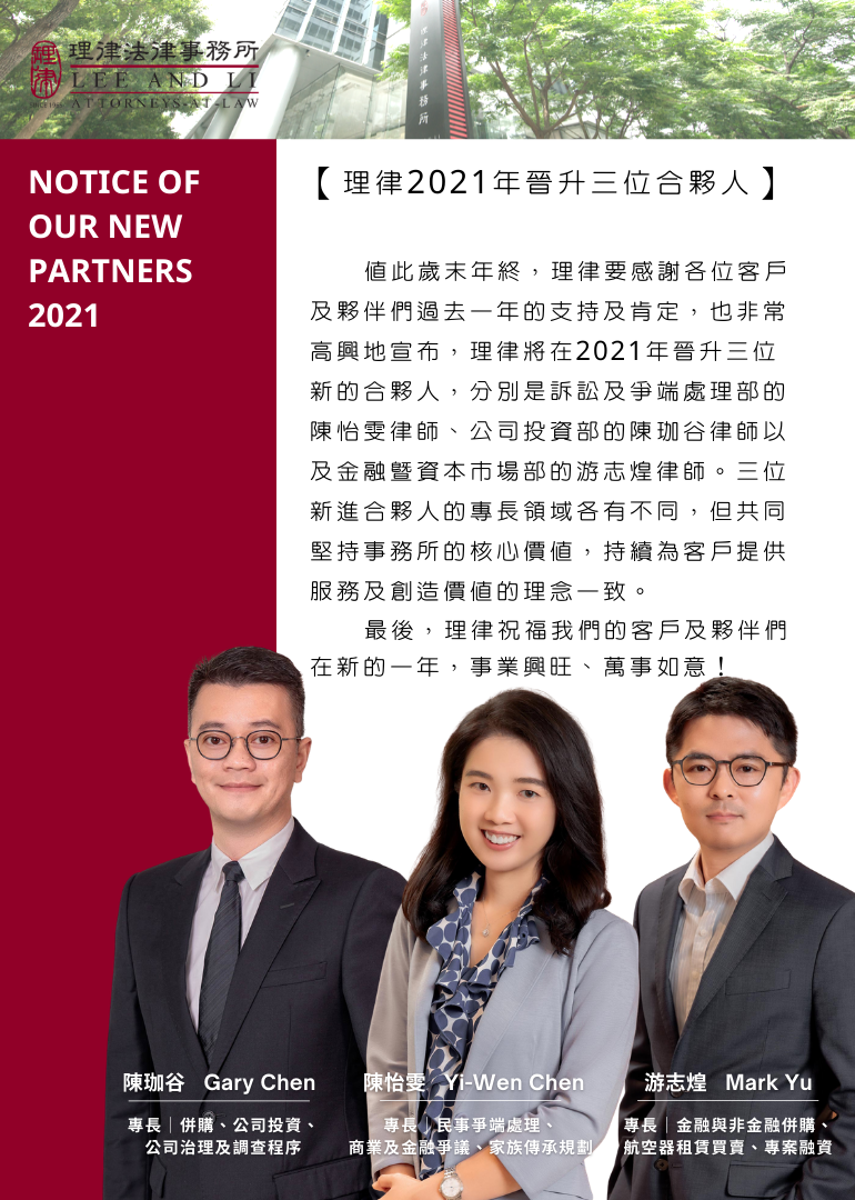 Newsletter 搜尋 年度搜尋: - - 2026 2025 2024 2023 2022 2021 2020 2019 2018 2017 專業領域: - - 銀行 資本市場 保險 公司投資 併購-非金融併購 併購-金融併購 稅務 勞工 醫藥生技 公平交易 不動產及營建 政府契約 數位產業、通訊傳播及個資保護 民事爭端處理 刑事案件 公法爭端處理 環境法 能源法 家族傳承規劃及家事案件 國際貿易法 專利權行使、營業秘密保護及爭端處理 專利申請及維護 專利撰寫及跨國專利保護 專利檢索、有效性及侵權鑑定 商標權 著作權行使、維護及爭端處理 商標權爭端處理 跨國商標及著作權保護 大陸案件小組 日本業務部 - - 銀行 資本市場 保險 公司投資 併購-非金融併購 併購-金融併購 稅務 勞工 醫藥生技 公平交易 不動產及營建 政府契約 數位產業、通訊傳播及個資保護 民事爭端處理 刑事案件 公法爭端處理 環境法 能源法 家族傳承規劃及家事案件 國際貿易法 專利權行使、營業秘密保護及爭端處理 專利申請及維護 專利撰寫及跨國專利保護 專利檢索、有效性及侵權鑑定 商標權 著作權行使、維護及爭端處理 商標權爭端處理 跨國商標及著作權保護 大陸案件小組 日本業務部 時間區間: ~ 關鍵字: 搜尋 清除 理律2021年晉升三位合夥人 12/29/2020